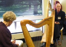 Besides teaching traditional Scottish music on the harp, he also does workshops in composing and arranging. Another area of interest for some groups would be his expertise in music therapy—a workshop he can tailor to medical professional as well as harp players (see more information below on this).